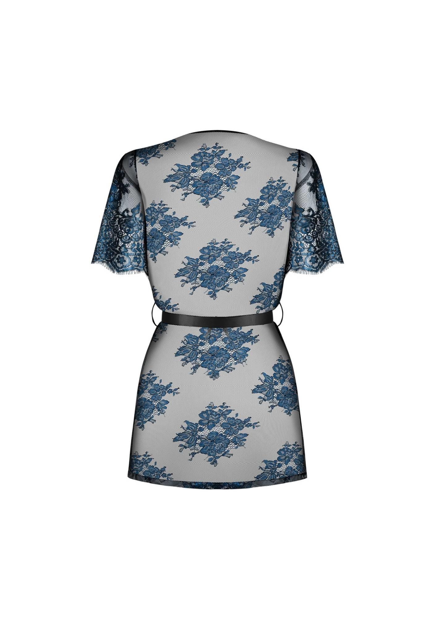 Marzy Ci się nowy szlafroczek pięknie komponujący się z Twoją ulubioną bielizną? Z czarującego połączenia zjawiskowej czerni i uroczego koloru indygo stworzyliśmy specjalnie dla Ciebie wyjątkowo cudny model ) Elegancki koronka, klasyczny krój i prześwitujący materiał.