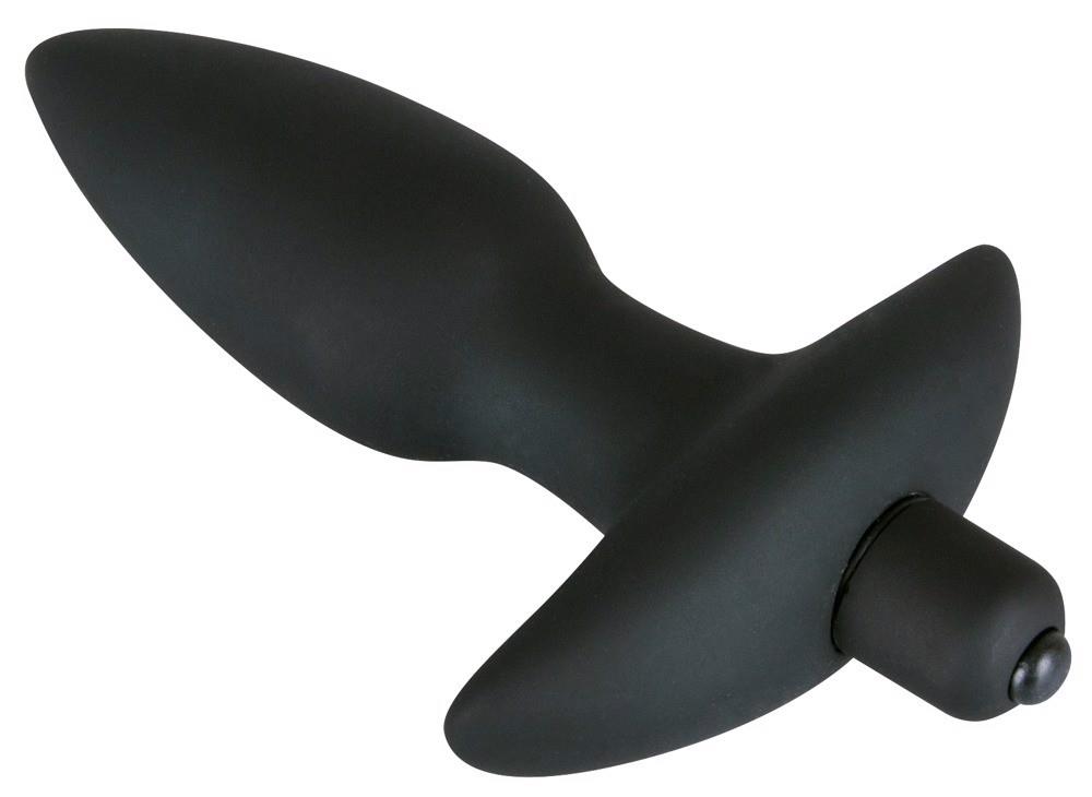 Czarna wtyczka analna z 5-stopniową wibracją za jednym naciśnięciem przycisku. Z uchwytem zwrotnym. Długość całkowita ok. 15 cm, głębokość wsunięcia 11 cm. średnica 2 cm do 3 cm. Materiał: silikon. (Prosimy zamawiać osobno baterie: 1 x Micro/AAA).