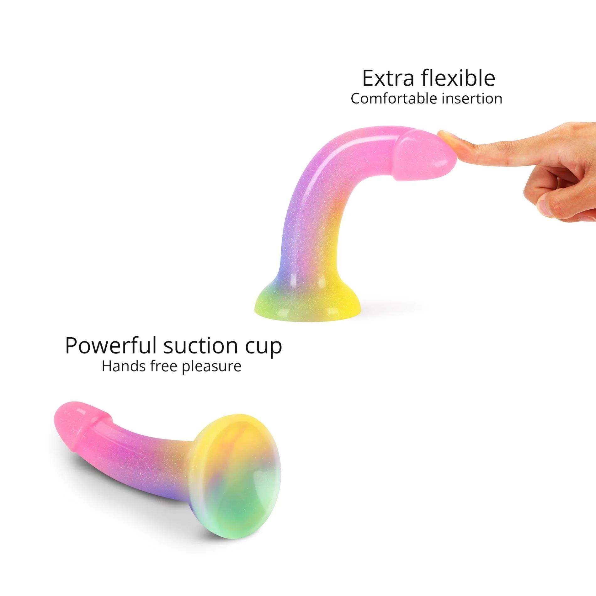 Stargazer rozjaśnia Twoje dni i olśniewa noce miłością i przyjemnością. Zapierające dech w piersiach kolory wywołają uśmiech na Twojej twarzy i sprawią, że będziesz chciał więcej. Seria Dildolls, w całości wykonana z płynnego silikonu, zapewnia wyjątkowo jedwabiste odczucie i wygodną penetrację dzięki zakrzywionej konstrukcji.