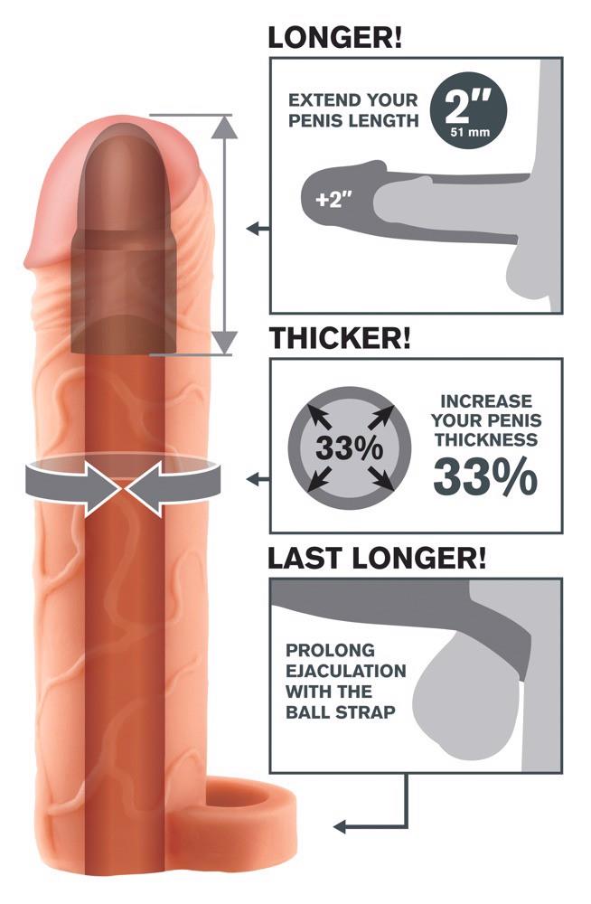 Powłoka penisa z mocnymi żyłkami i mocno wyściełanym żołędzią, która wydłuża penisa o 5,1 cm. Zagęszcza penisa o 33% i jednocześnie zapewnia wsparcie erekcji. Elastyczny pierścień jąder zapewnia szczególnie mocne przyleganie i cudowne uczucie chwytania.