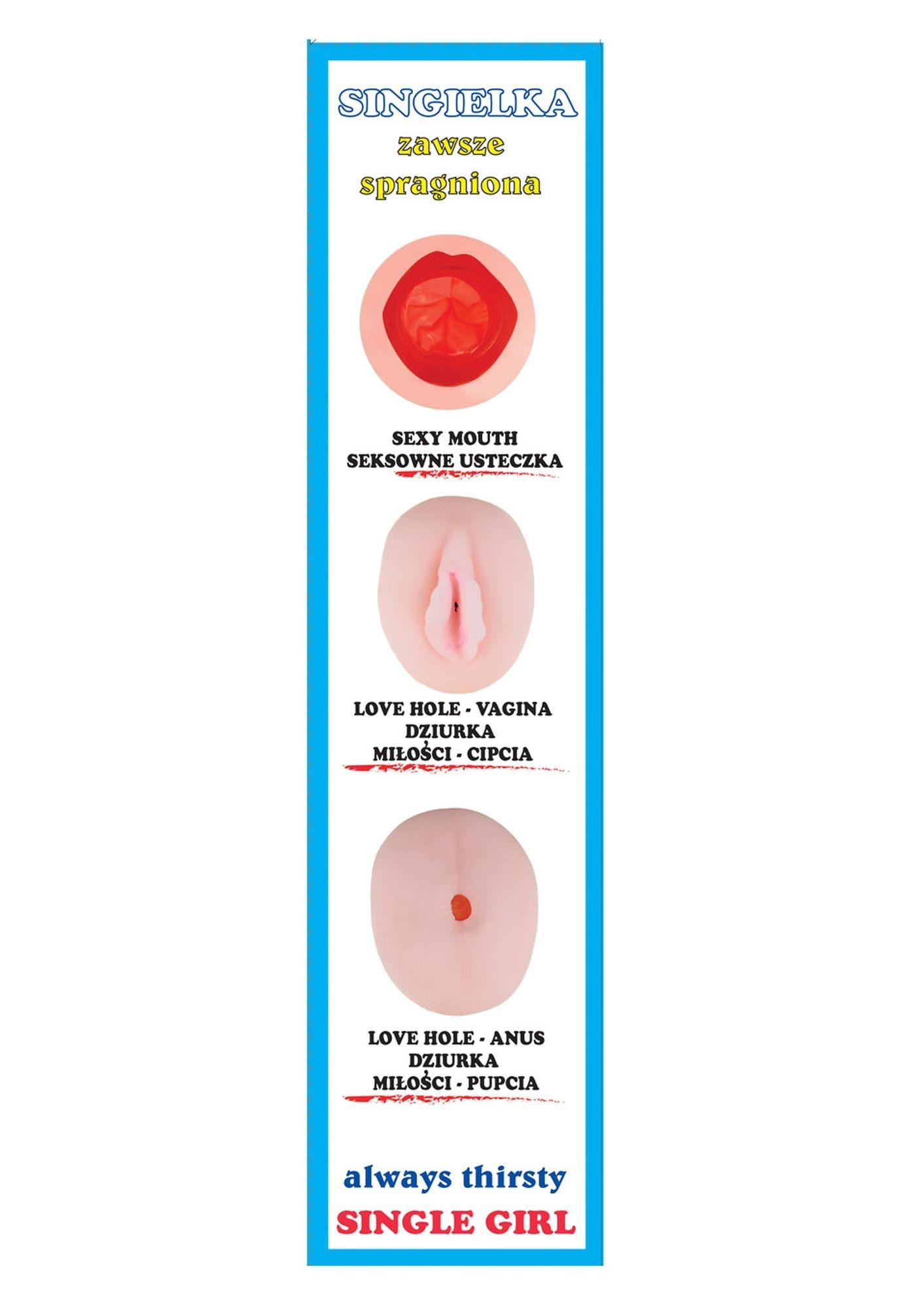 Singielka – lalka miłości. Piękna nadmuchiwana lalka miłości z czarującą nadrukowaną twarzą i stojącą pozycją, która kusi i wzbudza sensację. Jest ona naturalnych rozmiarów, posiada piersi i 3 kuszące dziurki miłosne, w których można umieścić penisa.