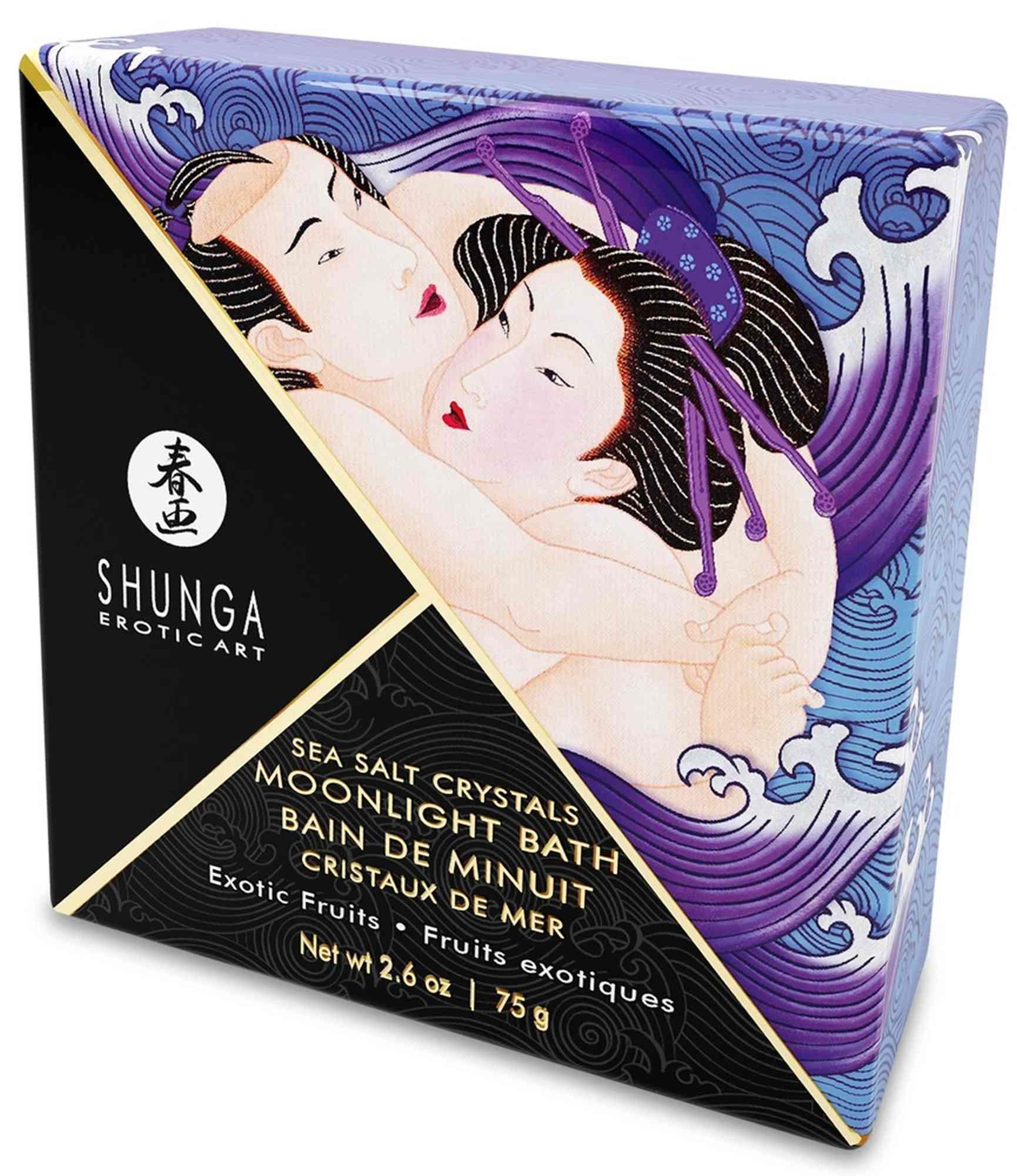Luksusowe kryształki soli morskiej Moonlight Bath Exotic Fruits od Shunga są idealne do odżywczej i przyjemnej kąpieli, która dotyka i uwodzi wszystkie zmysły – sama lub z partnerem. Kryształki sprawiają, że woda w kąpieli jest cudownie miękka i bąbelkowa. Zmieniają też wodę na piękny fioletowy kolor, nie pozostawiając żadnego osadu. Jest również bardzo pobudzająca dzięki delikatnemu i erotycznemu owocowemu zapachowi, który długo utrzymuje się na skórze i w pomieszczeniu. 100% sól z Morza Martwego oraz dodatkowe olejki ziołowe zapewniają nawilżenie i pielęgnują skórę, dzięki czemu jest ona aksamitnie miękka i gładka.