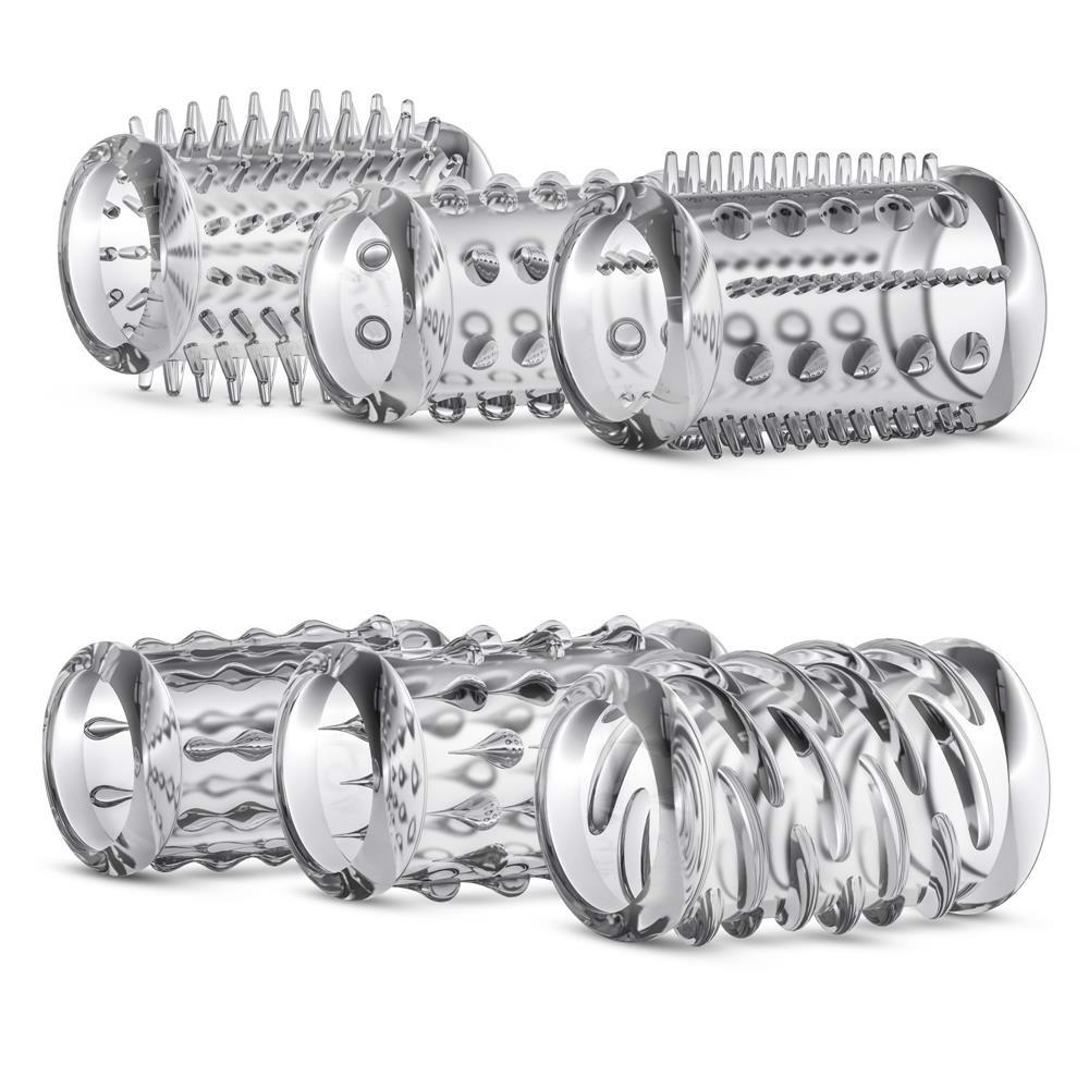 Zestaw rękawów Cock z 6 kształtami i teksturami do wypróbowania! Te rozciągliwe rękawy wzmacniające to prosty sposób na dodanie nowego poziomu przyjemności i doznań.