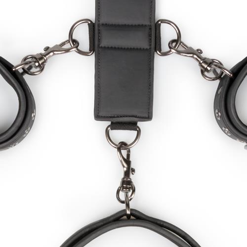 - Klamry: Mankiety i kołnierz są przymocowane do klamer, co umożliwia łatwe przypięcie do uprzęży oraz innych akcesoriów BDSM.