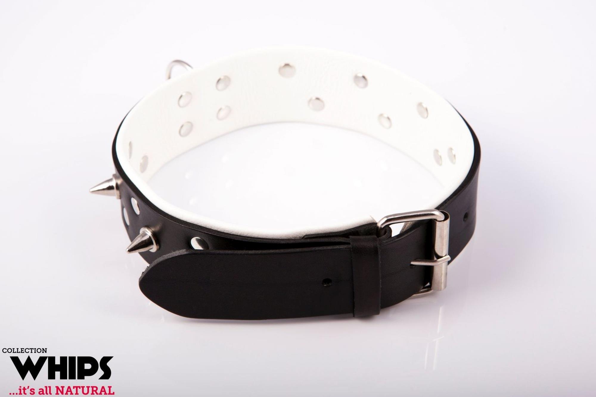 Skórzana obroża męska w kolorze białym, nabijana ćwiekami.